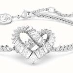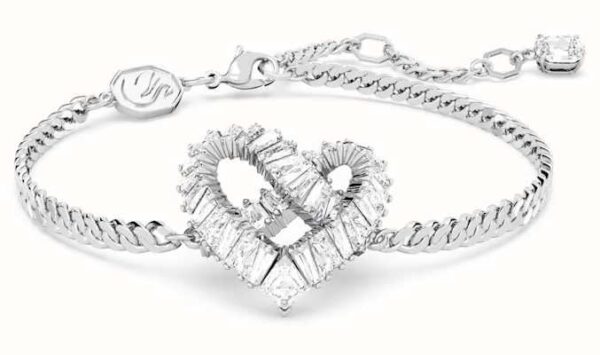 Przypominający plecionkę wzór tej bransoletki z powłoką z rodu jest naprawdę wyjątkowy. Aby uzyskać tak olśniewający efekt, wzór uformowano w elegancki kształt serca, którego całą powierzchnię pokrywają kryształy bezbarwne w szlifie typu baguette. Główny motyw bransoletki zamocowano na delikatnym łańcuszku z pojedynczym okrągłym kamieniem jubilerskim na jego końcu. To promieniejąca blaskiem ozdoba, którą można skomponować z kolczykami lub naszyjnikiem z tej samej rodziny, tworząc harmonijną całość. Wybierz tę ozdobę do swojej szkatułki z biżuterią lub podaruj ją ukochanej osobie jako idealny prezent.