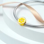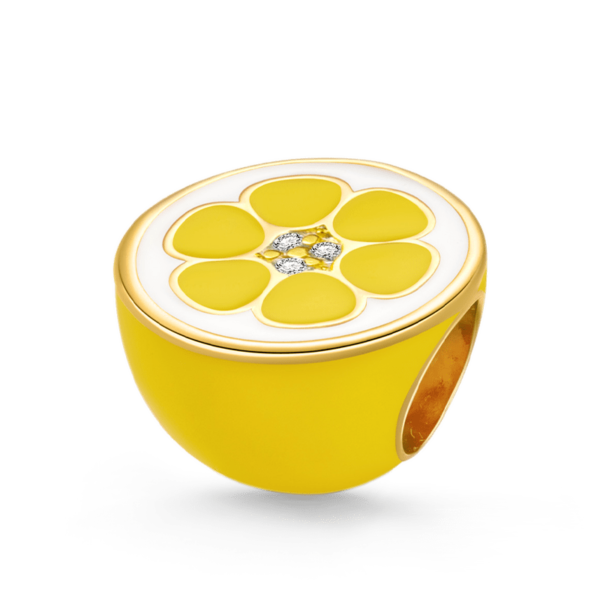 Charms starannie wykonany ze srebra p.925 pokryty żółtą i białą emalią. Pozłacane boki cytryny nadają jej delikatności i blasku. Idealnie wpasuje się w kompozycje zarówno złotą jak i srebrną. Ta piękna złota cytryna wprowadzi orzeźwienie i świeżość na Twojej bransoletce. Idealnie sprawdzi się jako prezent dla każdego miłośnika cytrusów.