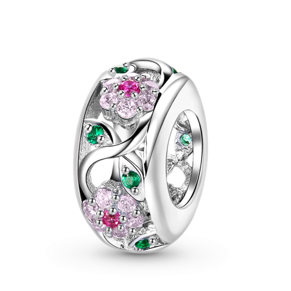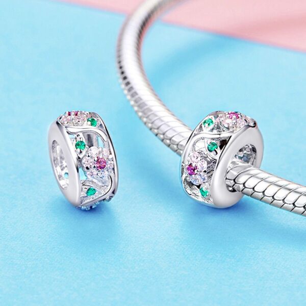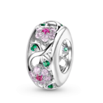 Ten przepięknie wykonany charms z motywem kwiatów wykonany jest ze srebra próby 925. Wzór kwiatów tworzą cyrkonie w kolorach: biały, różowy i zielony.