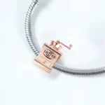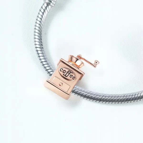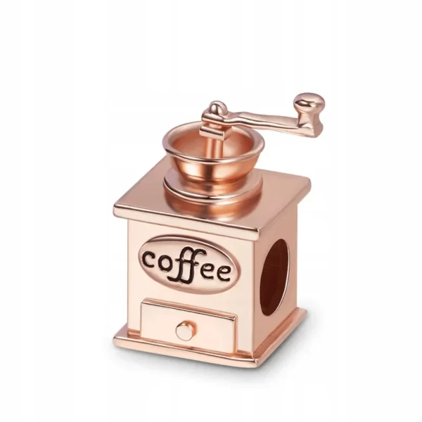 Przepiękny charms przedstawiający młynek do kawy. Element wykonany ze srebra pokrytego 18k różowym złotem. Jego przepiękny realistyczny kształt przypadnie do gustu wszystkim smakoszom tego trunku.