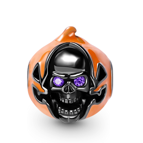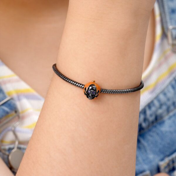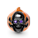 Ten oryginalny czarny charms jest wykonany ze srebra próby 925 i platerowany czarnym rutenem. Wyrazista pomarańczowa emalia dodaje mu charakteru. Z dyni wyłania się czarna czaszka z wyrazistymi fioletowymi oczami. Dynia to dobry prezent dla każdego kto lubi mroczniejsze tematy.