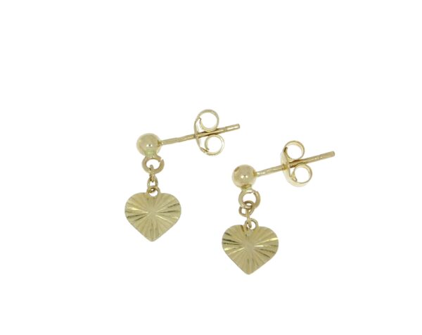 Subtelne kolczyki złote serca wykonane z wysokiej jakości złota próby 585. Kolczyki są wiszące, na ogniwkach umieszczono serduszka o szlifie diamentowym. Odpowiedni upominek dla miłośniczek delikatnej minimalistycznej biżuterii. Doskonały dowód miłości, troski, czy namiętności.