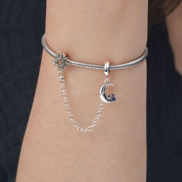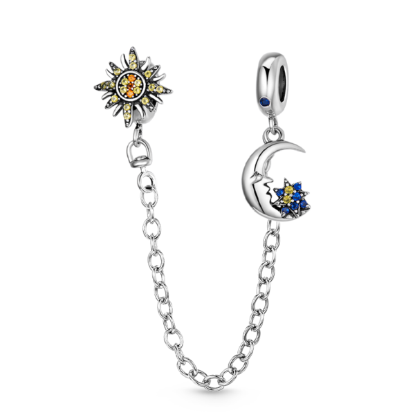 Przepiękny łańcuszek zabezpieczający ozdobiony żółtą gwiazdą osadzoną na pierścieniu i delikatnie zwisającym srebrnym księżycem. Przepiękne i szczegółowe zakończenie łańcuszka tworzy element ozdobny.