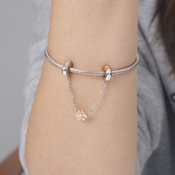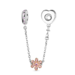 Przepiękny łańcuszek zabezpieczający z pozłacanym kwiatkiem. Obręcze montowane na bransoletce w kształcie serc przyozdobione różową cyrkonią.