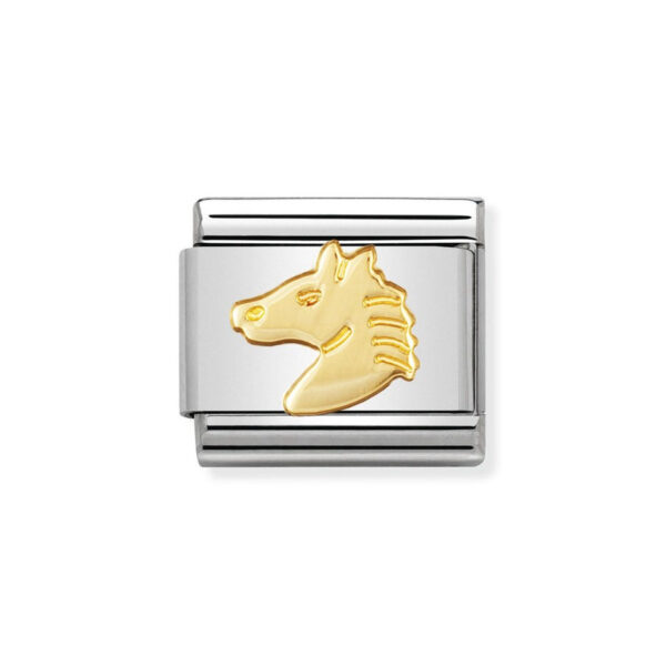 Oryginalny element do bransoletki komponowanej Nomination Composable Classic ze stali szlachetnej z głową konia z 18-karatowego złota.
