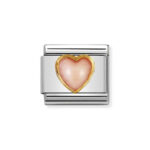 Moduł do klasycznej komponowanej bransoletki Nomination wykonany ze stali szlachetnej z sercem z różowego koralu w oblamówce 18-karatowego złota.