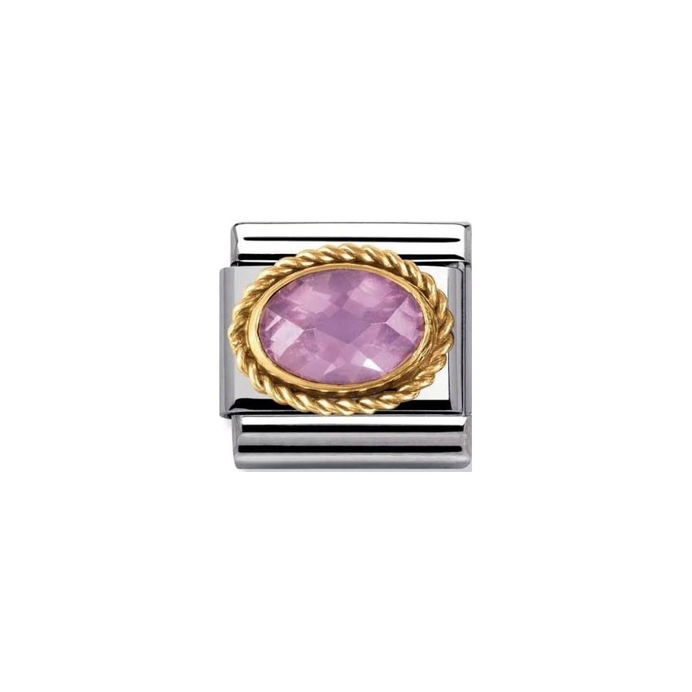 Moduł do klasycznej komponowanej bransoletki Nomination wykonany ze stali szlachetnej z różową cyrkonią w oblamówce z plecionki 18-karatowego złota.