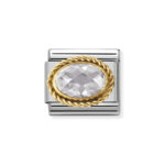 Moduł do klasycznej komponowanej bransoletki Nomination wykonany ze stali szlachetnej z białą cyrkonią w oblamówce z plecionki 18-karatowego złota.
