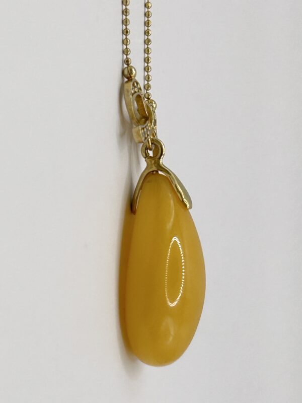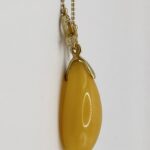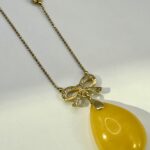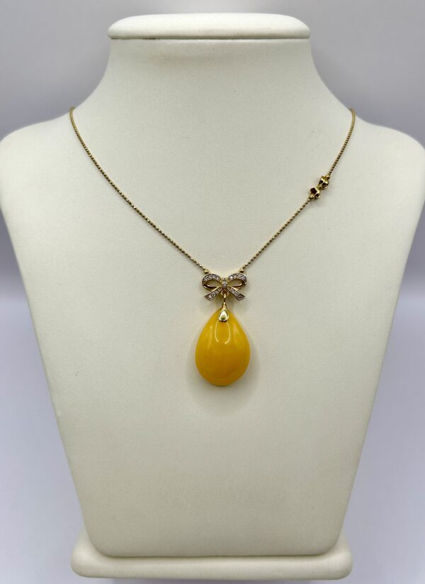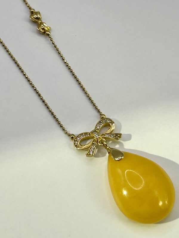 Elegancki NASZYJNIK – delikatne połączenie bursztynu i cyrkonii oprawionych w srebro w kolorze żółtego złota w kształcie finezyjnej wstążki.