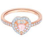 Powlekany różowym złotem pierścionek Swarovski wysadzany jest kryształami w oprawie pavé i ożywiony motywem głównym w postaci jasnoróżowego serca i detali pavé.