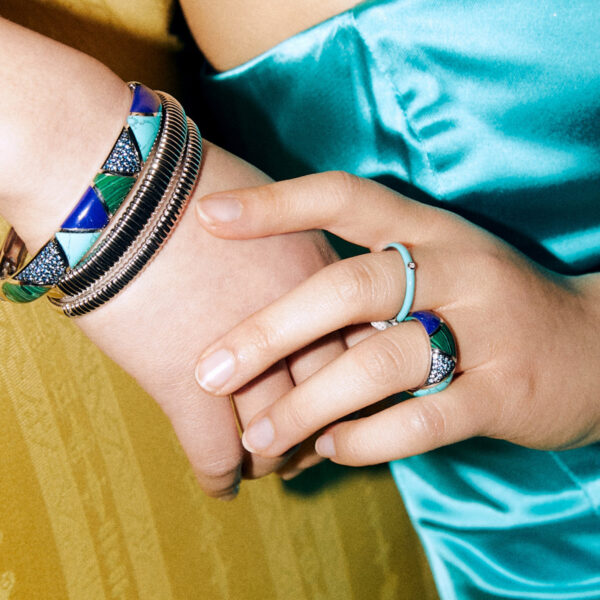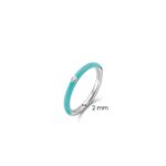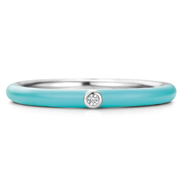 Srebrny pierścionek zdobiony emalią w kolorze turkusowym, rozświetlony centralną cyrkonią. Rodowany, by zachował blask. Model idealny do połączenia z innymi pierścionkami Mix&Match.