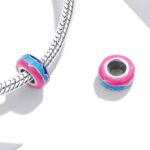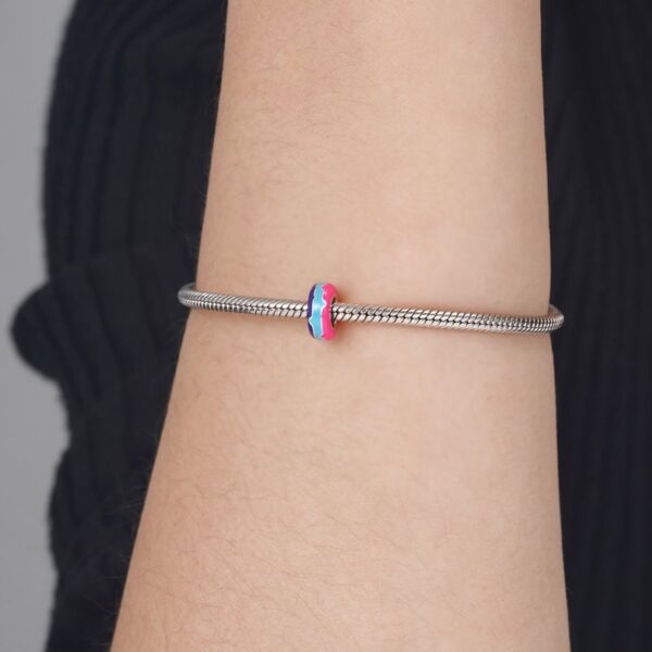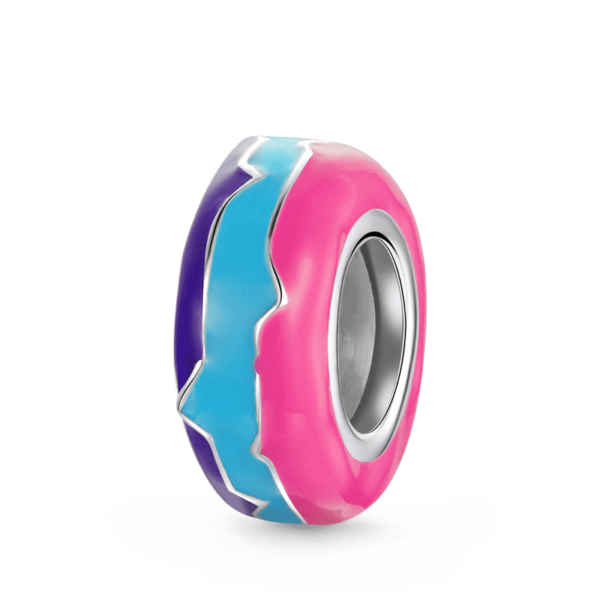 Przepiękny, wyrazisty separator z motywem wielokolorowych, niesymetrycznych linii. Element wykonany ze srebra p.925. Wewnątrz separatora znajduje się sylikonowy insert który uniemożliwia samoistne przemieszczanie się elementu na bransoletce. Separator służy do oddzielenia poszczególnych elementów jak również przyblokowanie pozostałych charmsów i zawieszek.