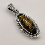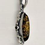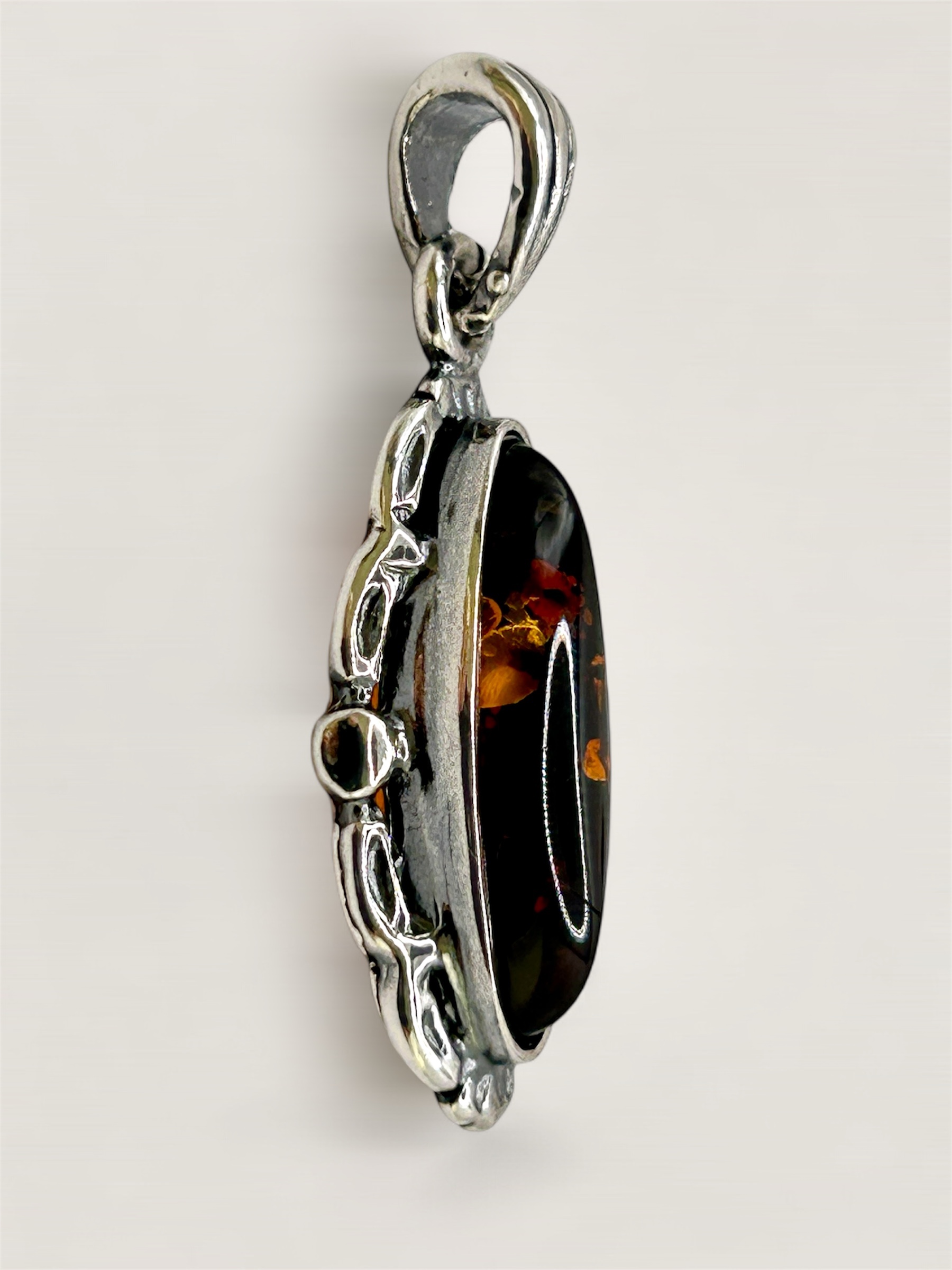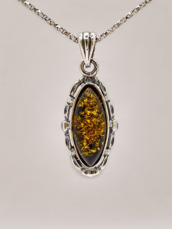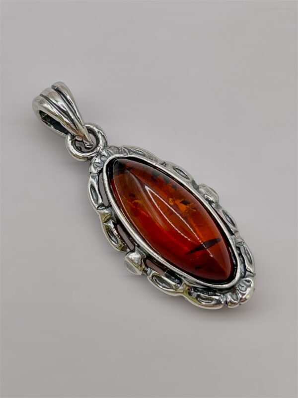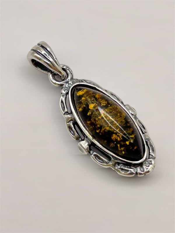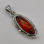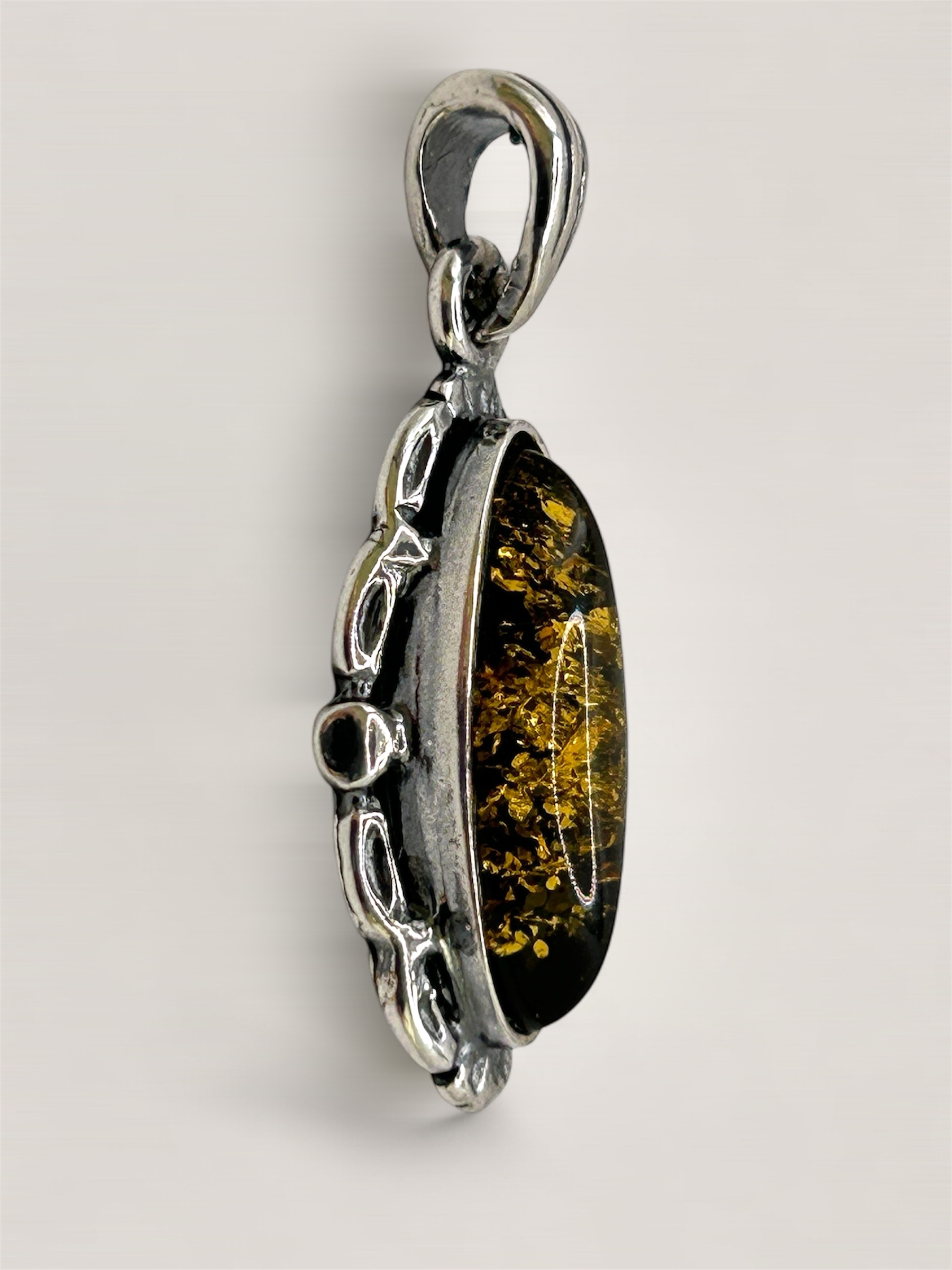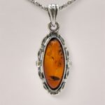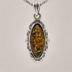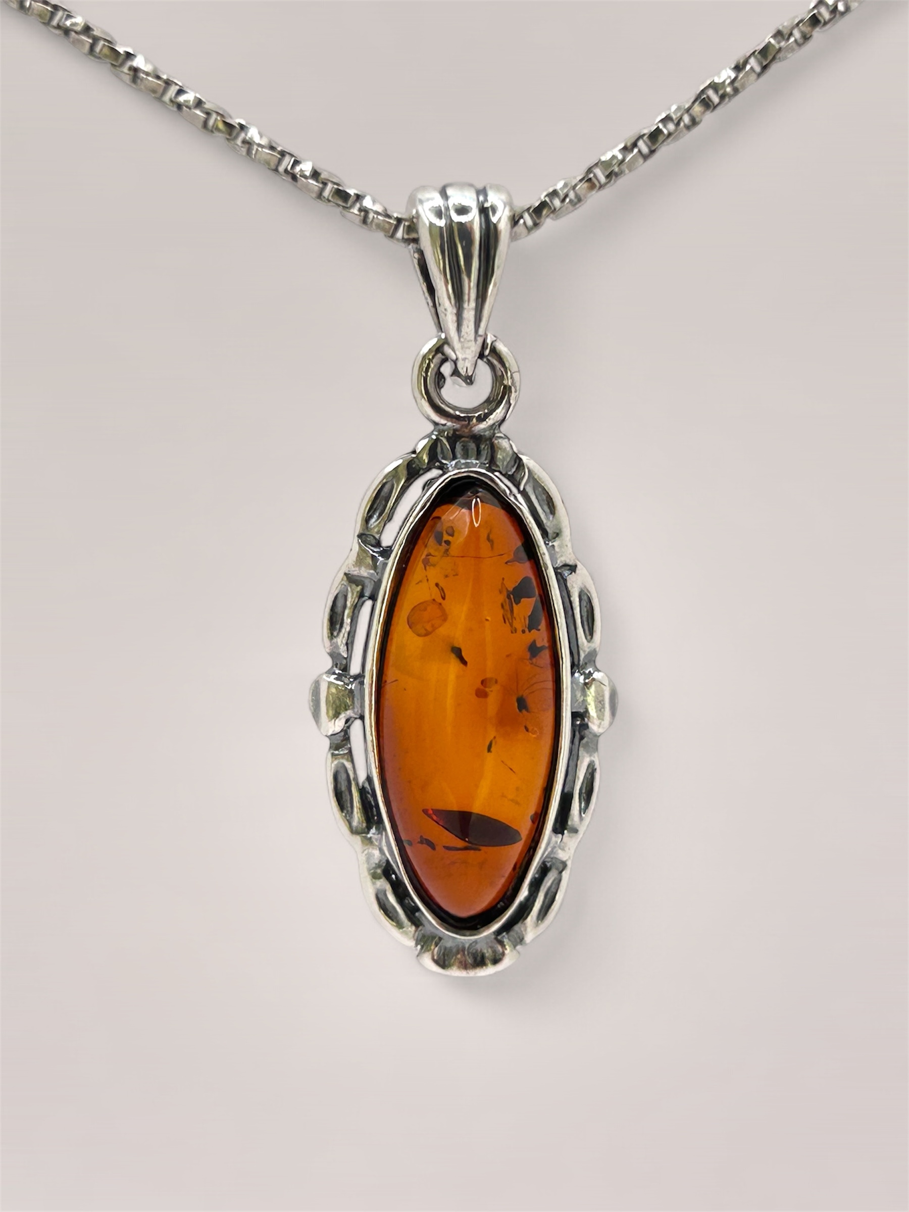 Wisiorek w postaci owalnego bursztynu oprawiony w srebro. Idealnie sprawdzi się jako elegancki dodatek do Twojego stroju.